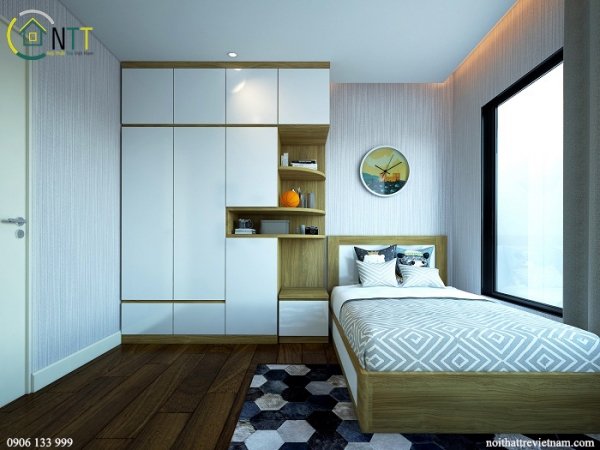 Cùng với bộ soffa trắng bên cạnh ô cửa lớn như thổi một làn gió mới đến cho căn phòng khiến nó không chỉ nhẹ nhàng với gam màu nâu nhạt mà còn tinh tế, trang nhã biết bao!Phòng ngủ với ga giường trắng và tủ đồ cá nhân nhỏ tiện nghi, không gian tận dụng được ánh sáng vàng đến từ những chiếc đèn ngủ. Tủ quần áo được sơn màu trắng cho đồng nhất với không gian xung quanh, tạo sự liền mạch.
